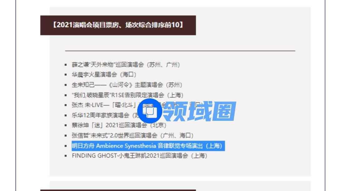 “2021演唱会项目票房、场次综合排序前10——第9名,明日方舟 Ambience Synesthesia 音律联觉专场演出(上海)”。