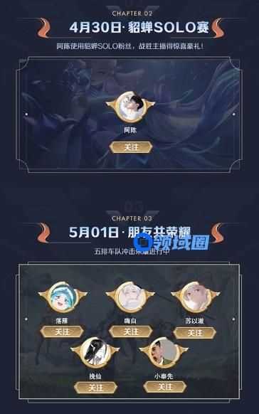 除了solo赛,活动期间,快手还将推出精彩的“朋友共荣耀”团队赛。5月1日,“洛雁(国服第一王昭君)”、“王者荣耀挽仙(国服典韦)”、“王者荣耀小奉先-国服吕布”以及“嗨白”、“苏以澈”五位快手游戏达人将联手直播,以五排车队冲击荣耀。