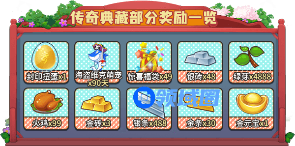 每局累计获得3份奖励:额外随机赠送其中一份:派对彩炮、拐杖糖、海洋之心、果酒桶、巧克力、生日蛋糕、强吻卡、花灯、甜蜜蛋糕、芒果布丁、金山、金猪存钱罐、香囊、水晶玫瑰100、电瓶车、哈密瓜。
