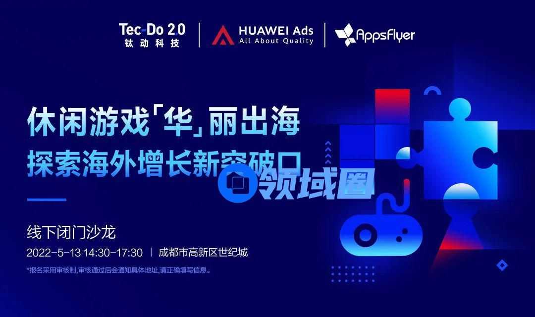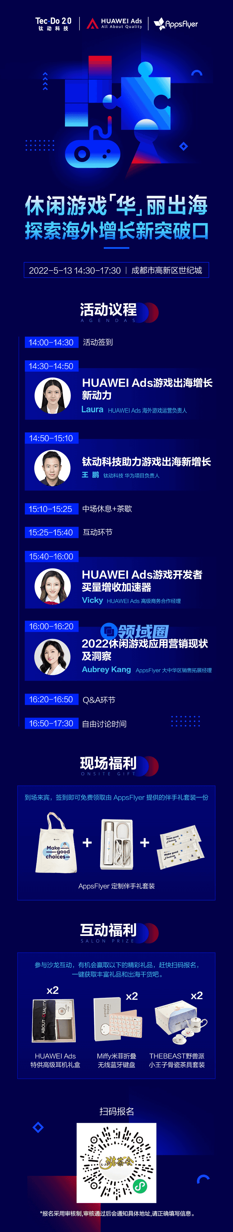 5月13日,Tec-Do联合HUAWEI Ads和 AppsFlyer 在成都高新区世纪城举办《休闲游戏「华」丽出海,探索海外增长新突破口》主题线下沙龙,解锁休闲游戏出海增长新玩法!