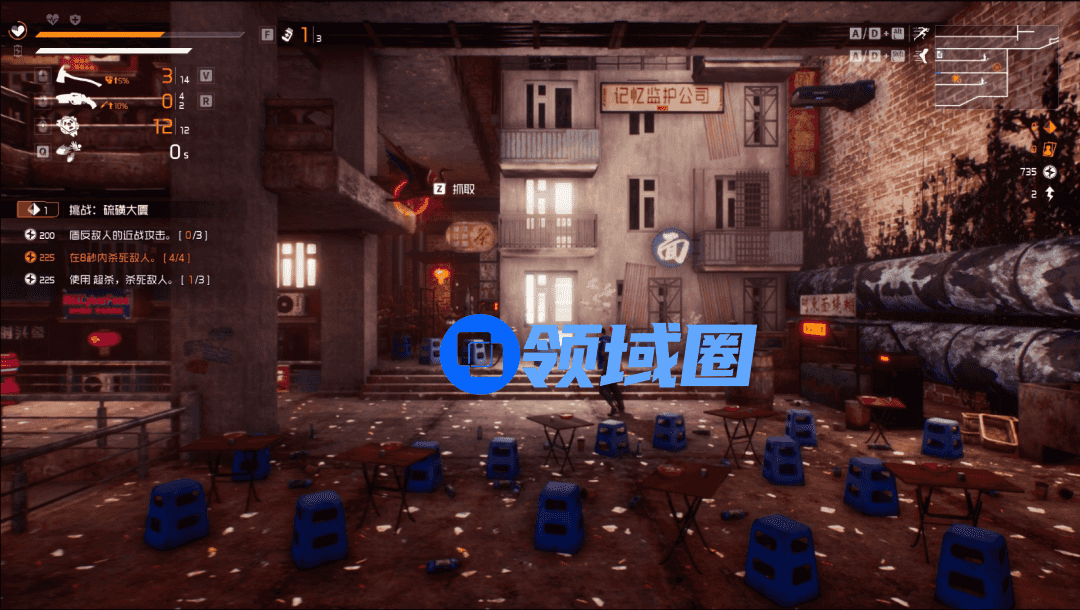除了宏大的场景以外,一些局部的场景也做的十分到位。比如在攻关过程中能看见极具特色的中式小巷,琳琅满目的霓虹灯广告牌、鳞次栉比洞开的小轩窗以及直耸而立的建筑营造出赛博朋克版的九龙寨,给初次步入关卡的玩家带来了极大的视觉冲击。