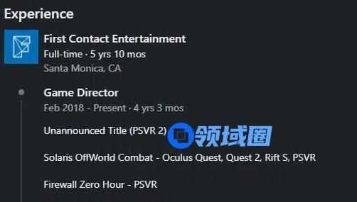 据外媒Upload VR报道,First Contact Enterainment游戏总监Damoun Shabestari在职场社交平台领英的资料显示,这家工作室正在开发一款尚未对外公布的PSVR 2游戏。