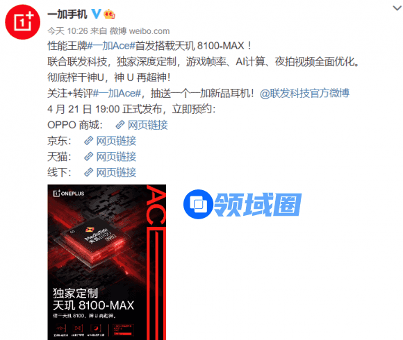 一加Ace新品发布会将于4月21日19:00召开,目前一加Ace现已开启预约,关于一加Ace的更多信息,可通过一加官网、一加手机官方微博等渠道进行了解。
