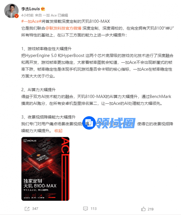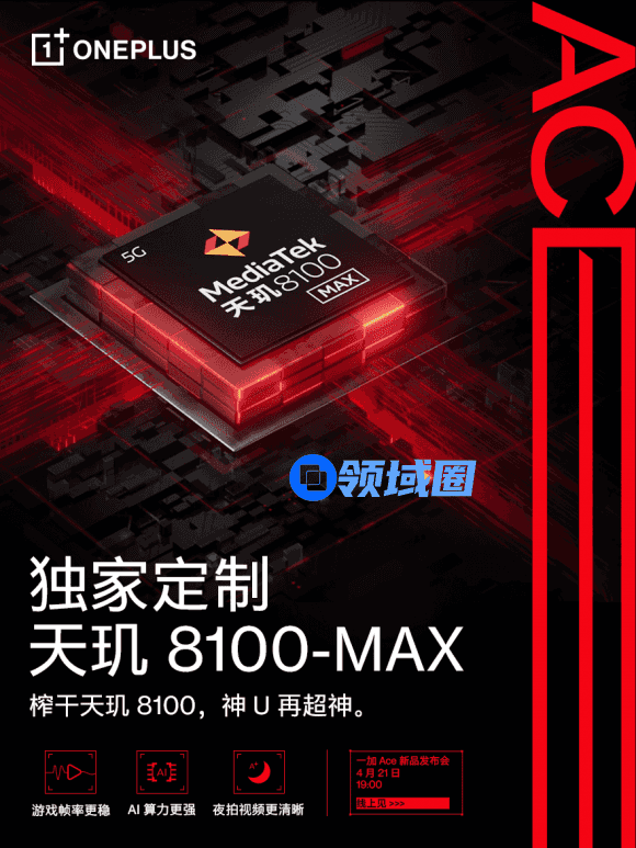 一加手机在4月18日公布一加Ace的大招:首发搭载独家定制的天玑8100-MAX芯片,将在游戏性能、夜景视频和AI计算三大维度再度提升,在天玑8100原有“神U”的基础上实现再突破。