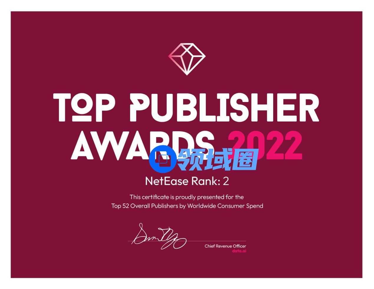 4月13日,data.ai发布了2022 Level Up年度全球发行商52强榜单(“2022 Level Up Top Publisher Awards”)。网易游戏凭借过去一年优异的市场表现,荣获52强中的第2名。值得一提的是,这已经是网易游戏连续第五年蝉联该榜单第2名,也从侧面印证了其稳定且持久的国际影响力。