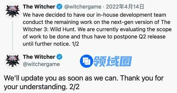 CDPR官方宣布《巫师3:狂猎》的次世代版将延期发售,本作原计划于2022年第二季度推出,新的发售日期将于日后公开。