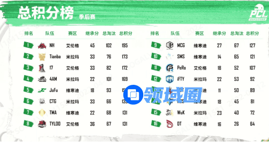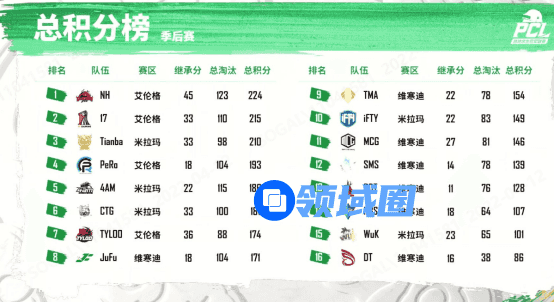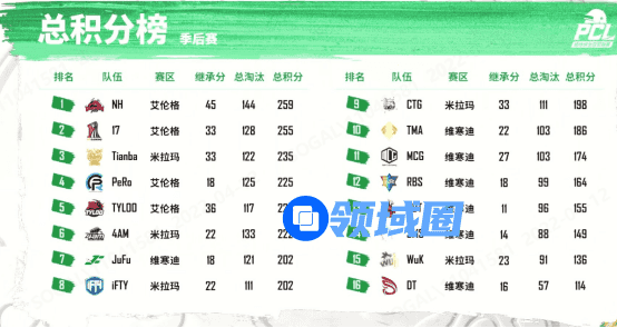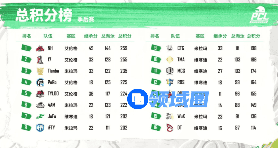 最终,NH战队以259总积分的微弱差距,领先17战队4分拿下季后赛冠军,同时NH战队也展现出了及其恐怖的统治力,以高达144的淘汰数一骑绝尘;17战队后来居上以128个淘汰数、255分位居第二;备受关注的Tianba战队也以122个淘汰数、255分拿到季后赛季军。此外,季后赛表现亮眼的PeRo战队和常规赛豪强TYLOO战队也名列前茅。