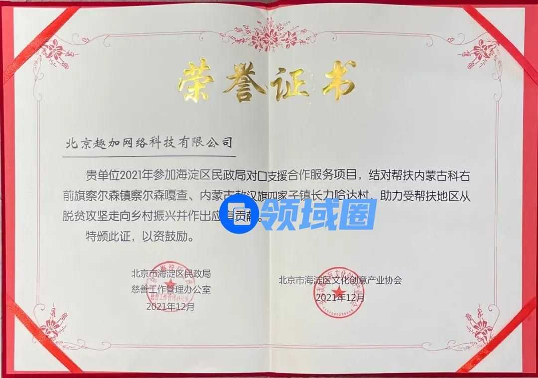 为助力乡村振兴,北京市海淀区文化创意产业协会发起“向海淀区对口乡村振兴地区捐款捐物”活动。知名游戏企业趣加互娱第一时间做出响应,充分担当社会责任,向帮扶地区内蒙古科右前旗察尔森镇察尔森嘎查、内蒙古敖汉旗四家子镇长力哈达村捐赠了《阿瓦隆之王》主题口罩、保温杯等物资,荣获北京市海淀区文化创意产业协会、海淀区民政局慈善工作管理办公室所颁发的帮扶工作荣誉证书。