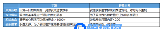 - 基于手游和开放世界的游戏特点,以及结合的冲突点思考,我整理了手游与开放世界游戏在资源获取、保持留存方式、游戏寿命、品质追求四个方向的对比: