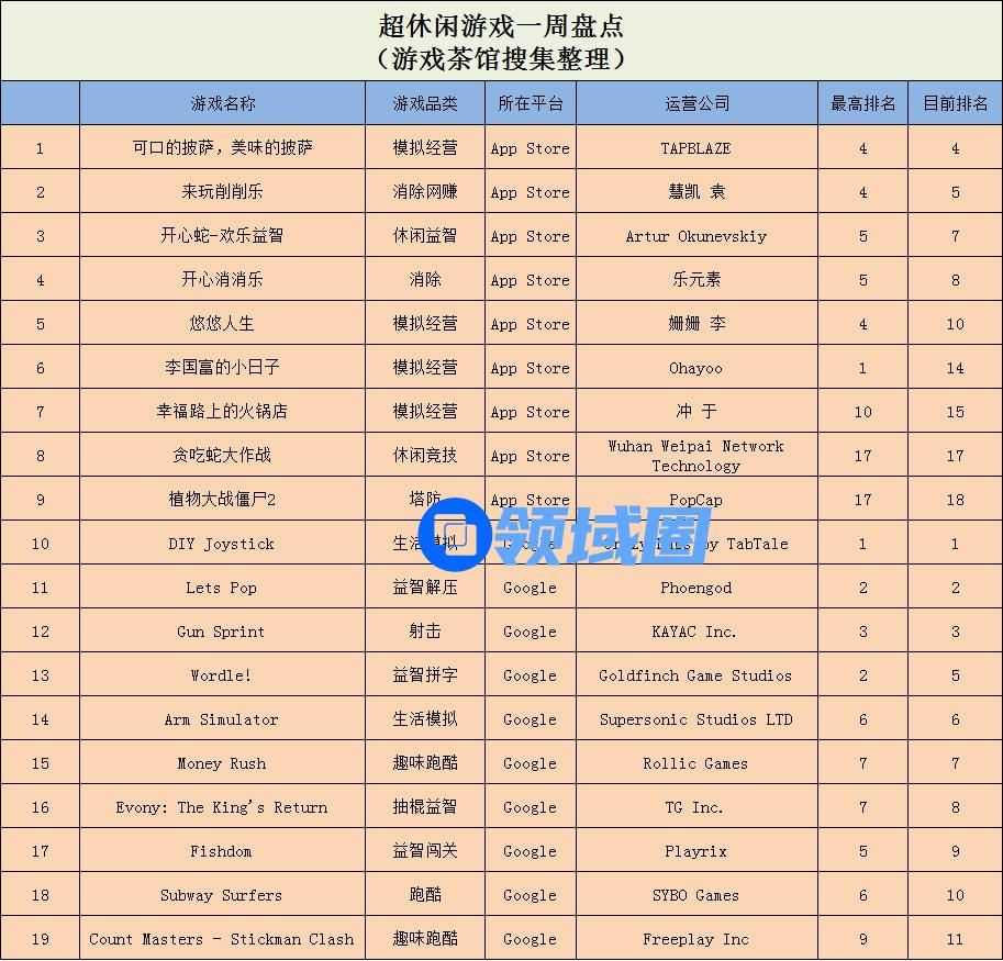 超休闲游戏方面,在App Store免费游戏榜单中,上周首次登榜的模拟经营游戏《可口的披萨,美味的披萨》冲上魁首;Google Play免费游戏榜单中,国产团队联合Crazy Labs打造的《DIY Joystick》稳坐榜首。