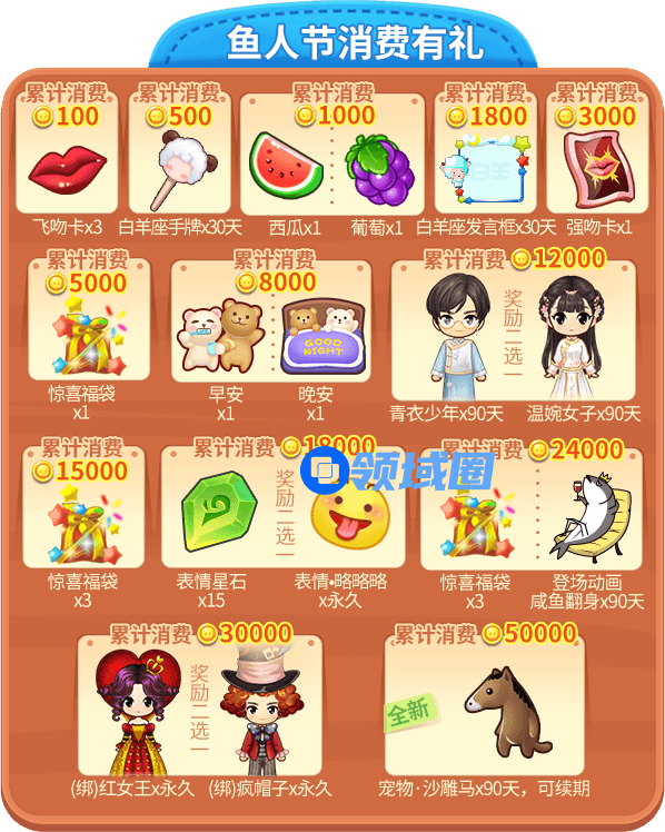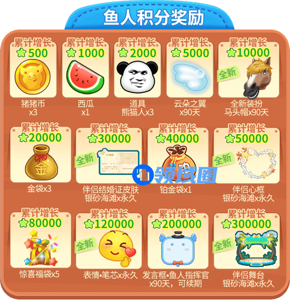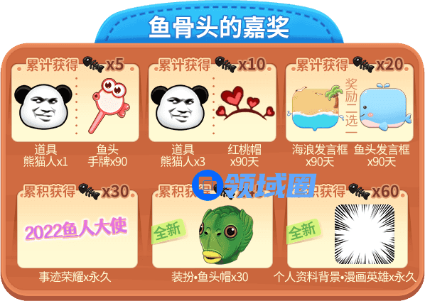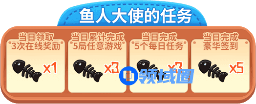 活动期间,每天完成“鱼人大使的任务”即可获得“鱼骨头”,根据累积获得的“鱼骨头”数量,领取特别奖励!