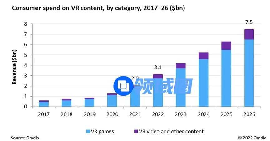 市场研究公司Omdia Analysis近期发布的一份报告显示,在2022年,全球VR内容市场收入预计将达到31亿美元,占电子游戏市场总收入的比例约为1.7%。