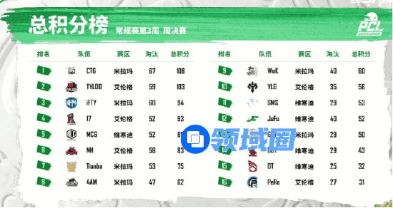 [Krafton Inc。旗下PUBG工作室]奋勇争先,龙吟四海!2022年绝地求生冠军联赛(PUBG CHAMPIONS LEAGUE,简称“PCL”)春季赛常规赛的第三周比赛已经结束。本周已临近尾声,各战队将运筹帷幄,把握好每个得分点,力争在接下来有限的比赛中以更高的积分冲击榜单!