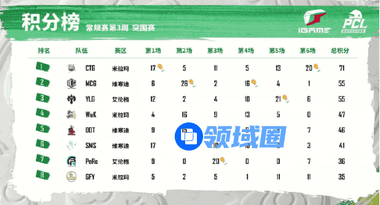 本周的突围赛同样精彩纷呈,各大战队分差甚小,稍有不慎将无缘本周周决赛。CTG战队的LuckyWss选手以2628的伤害、38%的得分贡献率,帮助队伍拿到以总积分71分位居突围赛榜首。MCG战队Peng选手和EviLLee选手携手为队伍拿下两鸡,均拿下11淘汰数为队伍拿到55分,取得突围赛第二名。YLG战队的Regret选手独挑大梁,以高达41%的得分贡献率、17个淘汰数为队伍送至突围赛第三名的位置,首次晋级周决赛。此外,PeRo战队和GFY战队以微弱分差,压线惊险晋级周决赛。