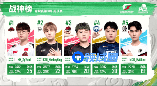本周周决赛中,没有卫冕三冠的NH战队依然存在感十足,队内ZpYan1选手以高达2.9的KDA,3412的伤害拿下25个淘汰以及39%的得分贡献率荣获战神榜榜首。CTG战队的MonkeyKing选手赛中一次奇迹一穿三证明其手感火热,本周周决赛战神榜中更是以3507的伤害和22个淘汰数坐稳第二名,以30%的得分贡献率帮助队伍获得冠军。TYLOO战队的CC108选手则是以3754的伤害和20个淘汰数位居第三。周季军iFTY战队的LongSkr选手更是凭个人累计淘汰突破900人PCL联赛历史击杀榜第一位。(历史第一),并以3692的伤害和20个淘汰数排名第四。此外,MCG战队的EviLLee选手以2220的伤害和30%的得分贡献率同样榜上有名。