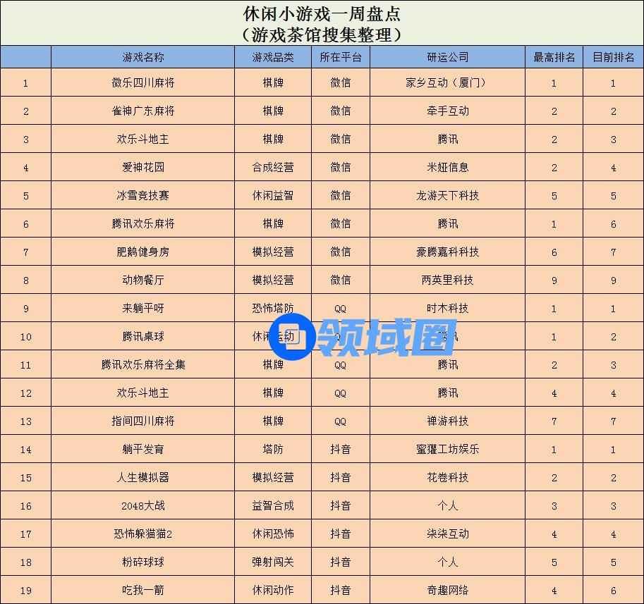 休闲新游周报每周统计微信小游戏、QQ小游戏、抖音小游戏、硬核小游戏以及App Store和Google Play上的新游爆款,并按照分类制作表格,将游戏排名情况等信息公布,希望给到行业同侪帮助。