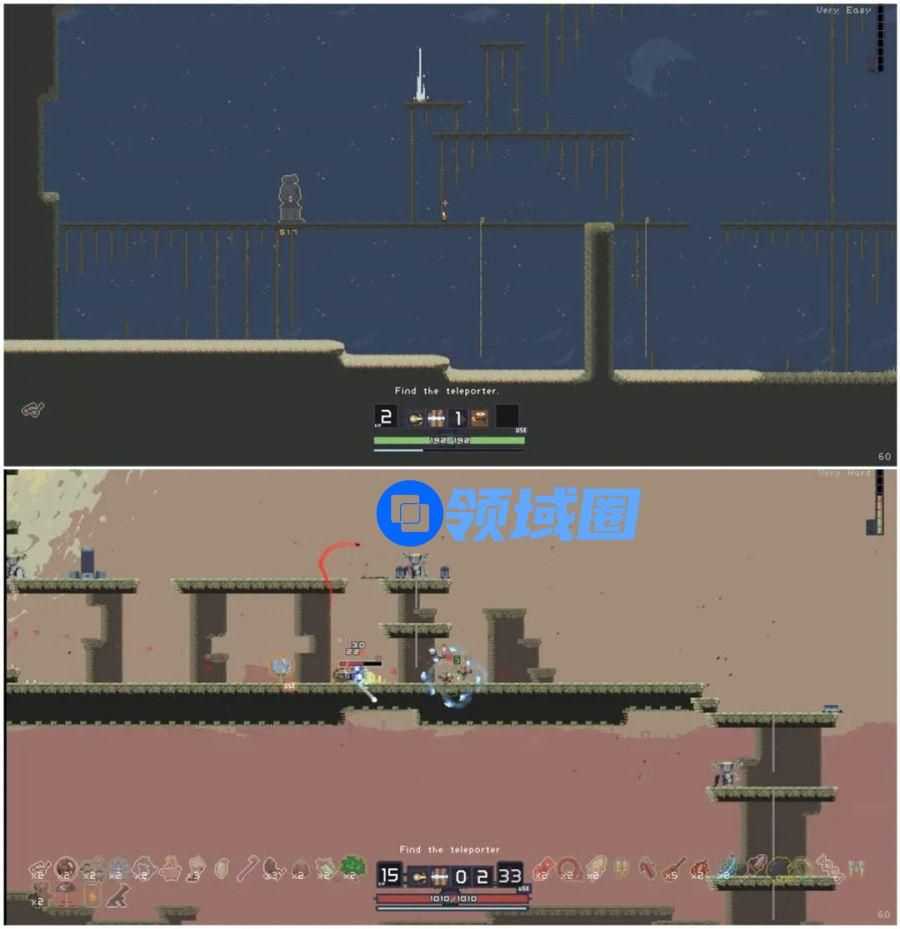 初玩《雨中冒险》第一部时,那个小小的像素小人,以及极为空旷,每个平台都至少有小人的五倍高的巨大场景的对比,立刻让我感到这个游戏简直是太大胆了。是的,它的人物小到让人一眼都分辨不清动作招式具体的样子(我一度以为工程师的盾格是在拍地板),这实际上一定程度上影响到玩家对人物招式和破局思路的理解。