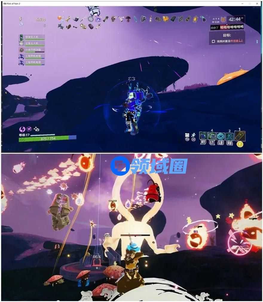 它并没有让玩家笨重地跟这些庞然巨物对战,一板一眼、一招一式的体会巨大boss,以及层出不穷的怪物的压迫感。《雨中冒险》没有选择这种压迫感设计最常见的概念,反倒是干脆彻底走向另一个极端,它的每一个装备都可以无限叠加,数值不会边际递减,如果顺利的话,你甚至可以把DPS堆到千万/秒,机动力可以达到全屏乱飞的地步。