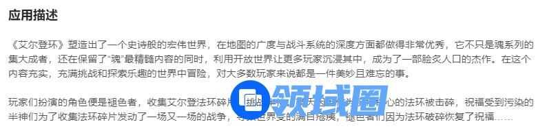 再来看看游戏的商店截图,可以看出这是一家很有“品位”的公司,为什么这么说?前两张选用了《艾尔登法环》比较有冲击力的截图,配合着“探索黑暗,逃出炼狱”“超大地图,广阔世界”非常贴合场景表现力的slogan,能第一时间内抓住玩家的眼球。