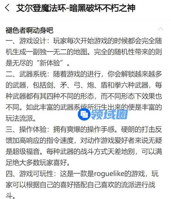 特别需要指出的是,《艾尔登魔法环》在游戏介绍上显然没有做好功课。除了第一句“褪色者啊动身吧”和游戏相关之外,大部分游戏描述都生搬硬套了隔壁《哈迪斯》,将游戏错误的描述成“Roguelike”游戏,这一点需要指出批评。