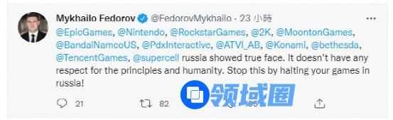 今日,乌克兰副总理「Mykhailo Fedorov」发布了一条推特,他表示俄罗斯完全不尊重人性原则,要求腾讯、任天堂、R星、2K、万代、科乐美在内的12家厂商禁止向俄罗斯销售游戏。