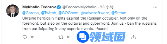 很快,「Mykhailo Fedorov」再次发推,声称乌克兰正在英勇的与俄罗斯作战,而作战不仅在前线同时也在网络与文化领域。他要求包括Twitch、Steam、GOG等平台与公司禁止俄罗斯人参加任何电子竞技活动。