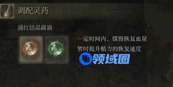 如果说上面装备只是前期法师变强的基础,那后面新加入的几个系统则在某种意义上彻底改变了游戏的规则。首先要介绍的就是灵药系统。在《老头环》中,玩家可以通过打败黄金树化身获得灵药配方,从而可以自由选择在短期内获得两种增益BUFF,而其中有一项增益buff就可以让法师在短时间内不消耗集中值(魔法值)。