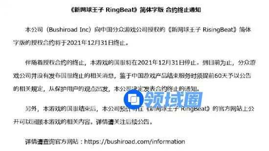 《新网球王子RisingBeat》代理权于2021年12月31日到期,可是中方代理商分众游戏秘而不宣,甚至在10月、11月推出了新卡池以及1.5周年活动。玩家根本看不出一丝停服的迹象。最终是日本版权方出于保护玩家、同时也是合规的目的(游戏停服前60日必须公告),单方面公开游戏即将停服的事实。