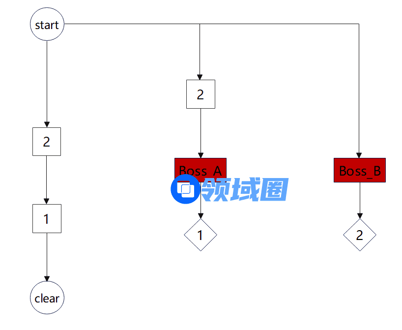 这种不给提示,没有书面的任务要求的设计在《空洞骑士》很常见,假设用方块代表锁,用红色的方块代表Boss战,用菱形代表钥匙。下面的图则可以代表一个最简单的银河恶魔城类型的游戏设计。