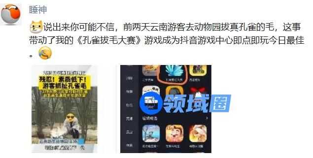 今日,睡神飞工作室创始人睡神发布了一条朋友圈称,游客拔孔雀毛的新闻将他们最近推出的新游戏《孔雀拔毛大赛》推上了抖音小游戏今日最佳榜单前列。