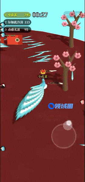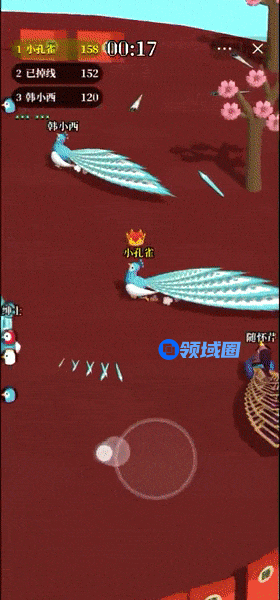 进入游戏后,玩家可以通过手指滑动,捡起地上的孔雀毛进行装备,可以松开手,发射孔雀毛进行攻击,帮助其他孔雀“脱毛”,然后趁其不备,捡起毛就跑,深藏功与名。