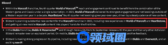 近日,在暴雪官方报告中,关于《魔兽》手游的消息再次被提及,暴雪表示在2022年将会首次为玩家带来《魔兽》手游的全新内容,同时还有《魔兽》和《炉石》的最新内容和体验。考虑到此前已经有消息爆料暴雪有一款全新IP的游戏已经开发多年,《OW2》和《暗黑4》也已经处于等待发售之中,再加上确定以及不确定的多款手游,暴雪似乎又行了?