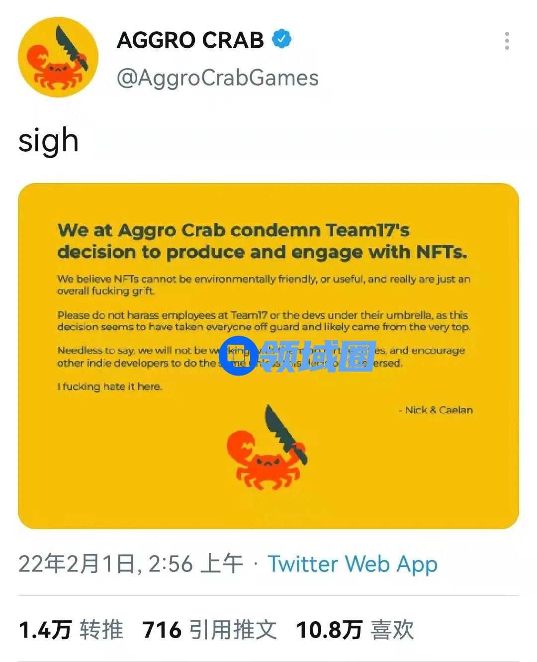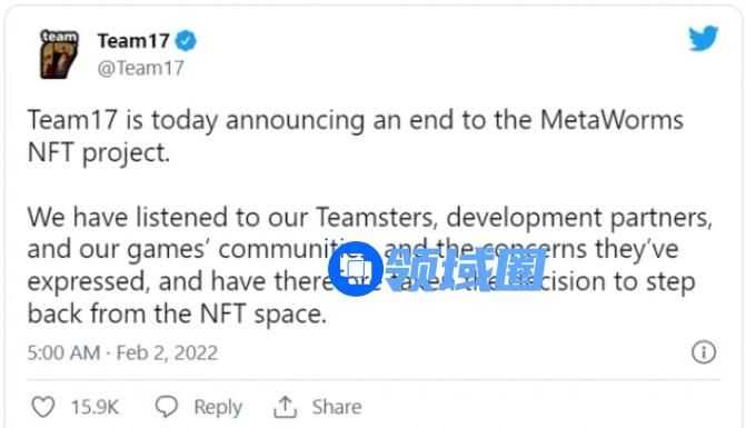 此前,曾与Team17合作过的游戏工作室Aggro Crab表示,如果Team17不取消NFT计划,它将不再与其进行合作。随后又有两家游戏公司发布了永不涉足NTF的声明并收获了大量网友的点赞。此外,网友甚至还创建了一个话题#TeamNoNFT ,以此表达对Team17的NFT计划的不满。在玩家和合作伙伴的集体炮轰下,Team17当日宣布放弃NFT计划。