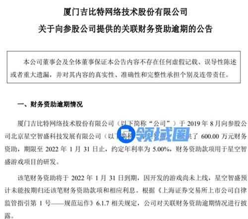 1月28日盘后,吉比特发布公告,披露给《纪元:变异》开发商星空智盛600万借款逾期。2019年8月时,吉比特向星空智盛提供了600万的财务资助,并约定借款29个月,年化利率5%。但由于《纪元:变异》延期,星空智盛无力在约定期限支付本息。吉比特表示财务资助逾期对公司无重大影响,后续会在《纪元:变异》上线后用销售分成抵扣财务资助本息。”