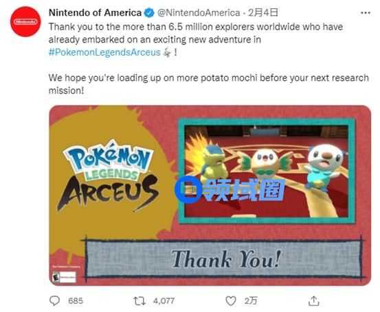 任天堂表示,“《宝可梦传说:阿尔宙斯》自1月28号发售之后,全球已经有超过650万玩家开始了激动人心的冒险”。值得一提的是,本作也成功刷新NS平台《宝可梦》销量最快的记录。