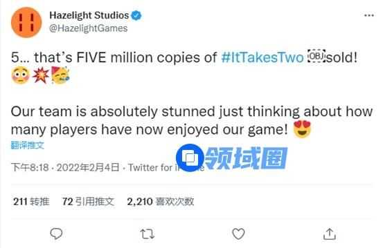 正式发售之后,《双人成行》的口碑也是水涨船高,甚至最后拿下了TGA年度最佳游戏的桂冠,成为了今年最受欢迎的独立游戏之一。而在近日,开发团队也在推特上表示,“《双人成行》的销量硬突破500万,我和我的小伙伴都惊呆了,想想会有多少玩家喜欢我们的游戏啊。”