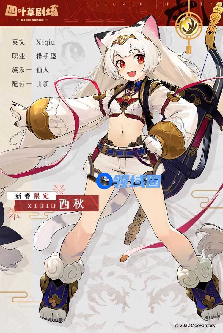 白虎作为中国古代神话中天之四灵之一,又逢壬寅年,新春限定SSR演员——西秋即将登场!神兽白虎为西方战神,五行主金,象征四季中的“秋”,所以我们将这位角色命名为“西秋”,并让她出生于东方大陆,添加了在白虎堂学习、修炼,并成为了仙人的过去,更多关于她的故事等你解锁!