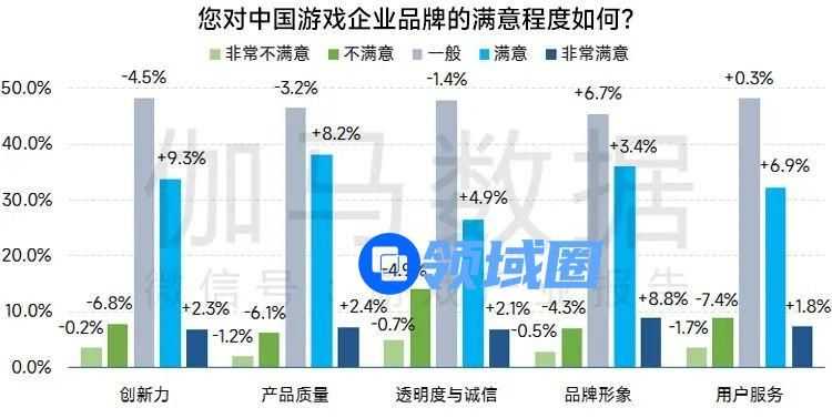 相较于2019年,2021年用户对于中国游戏企业在创新力、产品质量、透明度与诚信、品牌形象、用户服务方面的满意度均稳步上升。