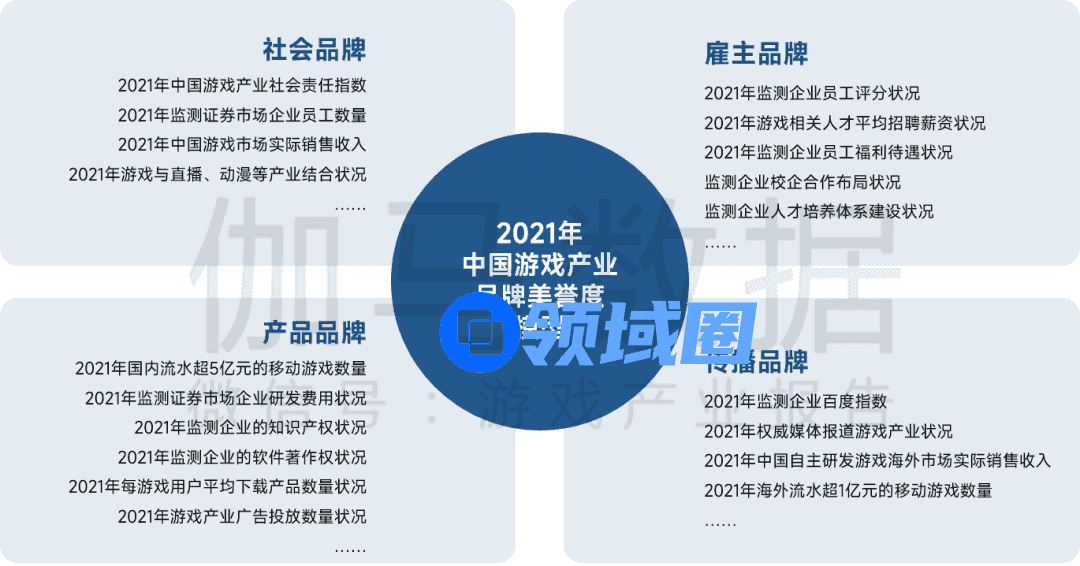 伽马数据从社会品牌、雇主品牌、产品品牌、传播品牌四个维度构建中国游戏产业品牌美誉度指数模型。其中,社会品牌、雇主品牌、产品品牌重点考量游戏产业面向员工、游戏用户、社会公众、供应商、客户、投资者等利益主体的品牌塑造,而传播品牌则重点考量品牌影响事件的扩散力度。需要注意的是,由于本报告中传播品牌维度侧重于面向公众的整体品牌传播,但在海外中国游戏产业的公众传播与用户传播较为接近,因而游戏用户对产品的品牌印象海外归入传播品牌维度,国内归入产品品牌维度。