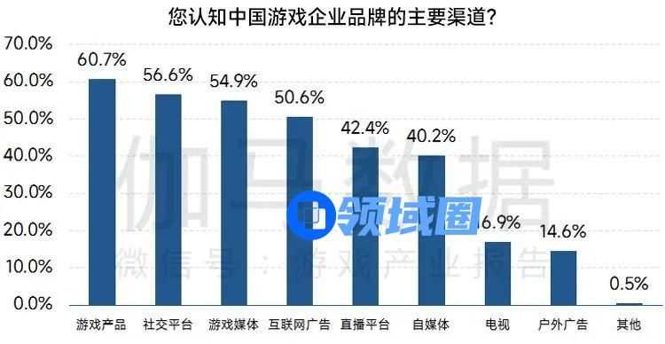 传播品牌主要考量中国游戏产业在不同渠道的品牌影响力状况,并观测中国游戏产业品牌的建设渠道与成果。根据伽马数据调研显示,除游戏产品外,社交平台、游戏媒体、互联网广告等均成为了用户认知中国游戏企业品牌的渠道。用户认知企业品牌维度呈现多元化特征,借助于这一特征,游戏企业也强化了在多个平台上的品牌建设,除注册官方微博号、公众号外,还与用户展开深度的线上、线下互动。