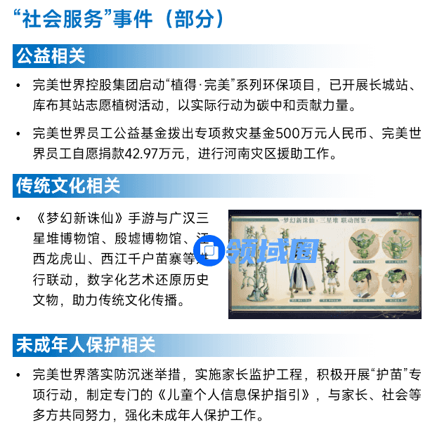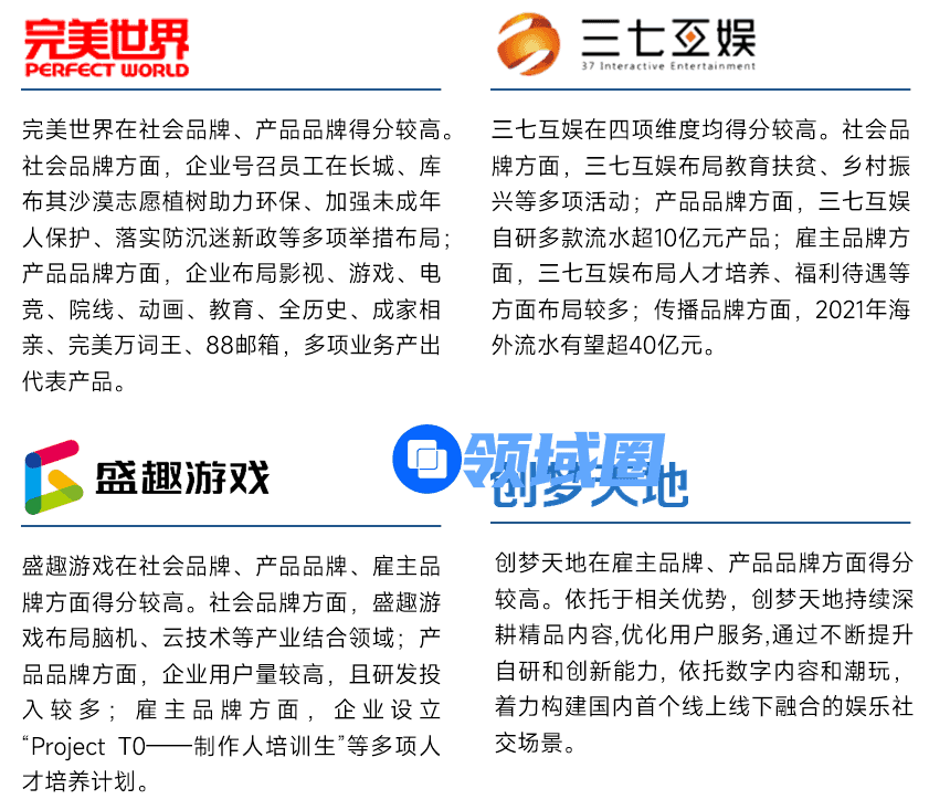 完美世界控股集团“业务协同”“社会服务”等品牌标签已较为明显。“业务协同”品牌标签基于完美世界在多领域的布局,现阶段,完美世界在游戏业务之外已拥有影视、电竞、院线、动画、教育、全历史、成家相亲、完美万词王、88邮箱等板块,各布局领域均取得一定成绩。同时,各领域间存在一定关联,为业务协同提供可能性,比如影视为游戏提供IP、游戏为电竞提供产品、教育为其他领域提供人才,证明业务协同的可行。而在企业享受业务协同增益的同时,品牌本身也具备可持续发展潜力。“社会服务”品牌标签基于完美世界近年在公益事业、传承历史文化、未成年人保护等领域的布局,比如启动“植得·完美”系列环保项目、投身教育帮扶、开展员工公益支教等。随着完美世界专门设立可持续发展与合作事业群,“社会服务”的品牌影响力有望进一步深化。