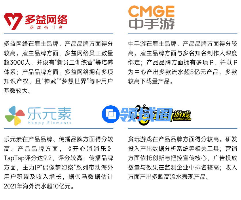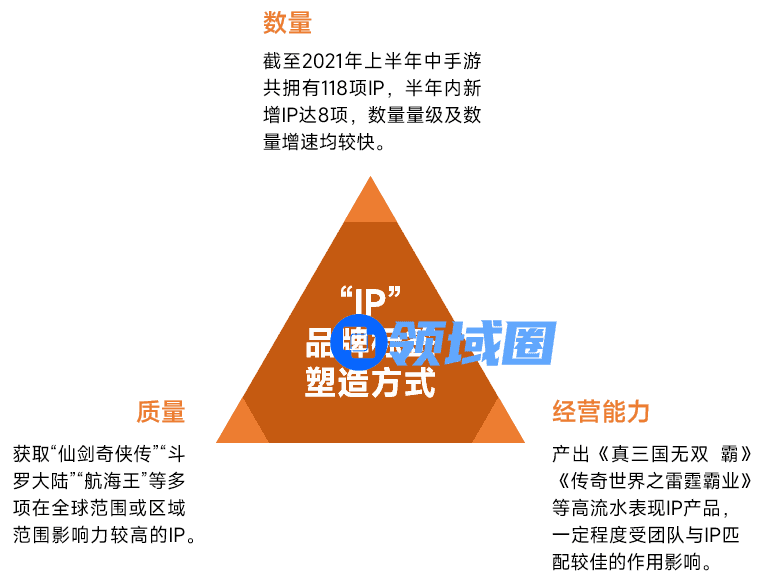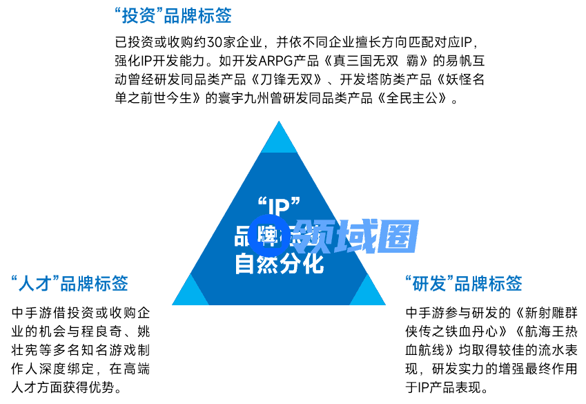 中手游深耕IP赛道形成“投资”“研发”“人才”等多项品牌或可为布局赛道深耕的企业提供更多参考中手游拥有“IP”“投资”“研发”“人才”等多项品牌标签。同时,中手游作为“品牌建设突出企业” 或将为布局赛道深耕的企业提供较大参考价值,参考价值具体体现在塑造成果与塑造方式中。从塑造成果来看,中手游“投资”“研发”“人才”品牌标签的形成均与“IP” 关系较密,一定程度上是深化“IP”的过程中自然分化的品牌标签,这意味着品牌的多元与布局赛道的多寡并无绝对关联。同时,品牌塑造成果与赛道选取方向关联较弱,虽然企业选择的赛道存在差异,但均有可能取得类似中手游在IP赛道取得的成果。从塑造方式来看,从数量、质量、经营能力领域发力是中手游塑造“IP”品牌标签的主要方式,有意布局赛道深耕的企业也可以考虑从三个领域其中之一入手。同时随着企业单一领域布局水平的提升,中手游当前取得的领域协同优势或将被更多企业参考。
