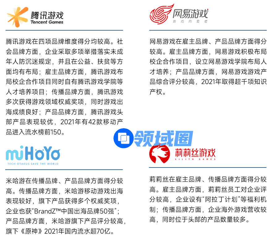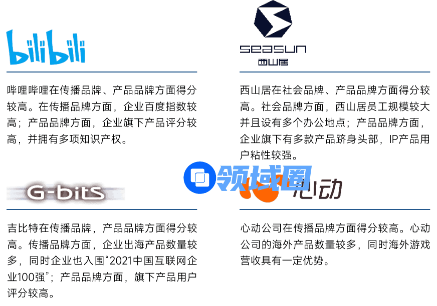 伽马数据依据模型评选出部分本年度“品牌建设突出企业”。模型构建上,伽马数据从社会品牌、雇主品牌、产品品牌、传播品牌构建企业品牌竞争力模型,企业模型的维度选取与产业模型一致,仅在具体考核项目上进行调整。
