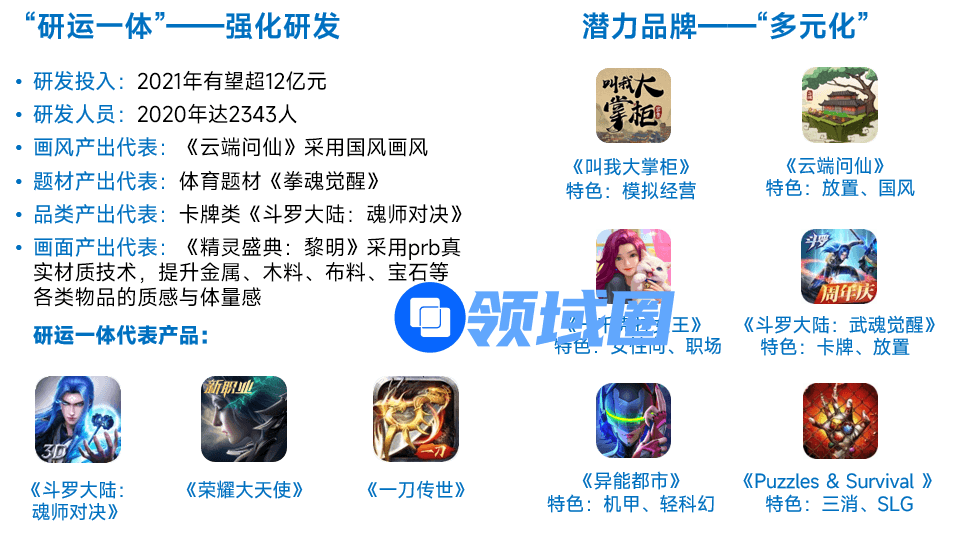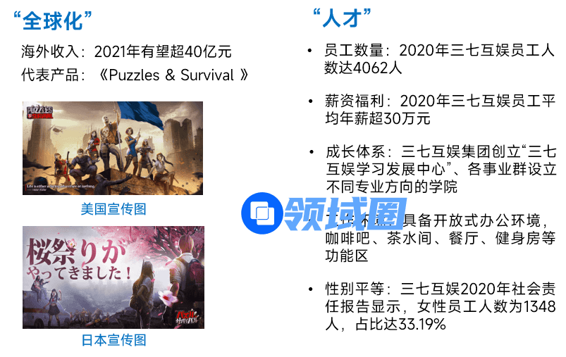 三七互娱拥有“研运一体”“全球化”“人才”等多项品牌标签“多元化”等新品牌影响力将进一步增强“研运一体”“全球化”“人才” 等品牌标签组成了三七互娱的品牌优势。研运一体由研发与运营共同构成,具体到三七互娱,企业在运营方面的先期优势更为明显,因而强化研发实力成为其塑造“研运一体”品牌标签的核心环节。具体举措上,三七互娱较大力度的增加研发投入,研发投入主要用于题材、画面、画风、品类、玩法等方面,现阶段已带动研运一体收入贡献比重明显提升。同时,随着企业对某一方面的持续加码,“多元化”“SLG”等从 “研运一体”中衍生的品牌标签影响力将进一步增强;“全球化”品牌标签既受投资收购企业的影响,也受重视本土化的影响,如同样为产品宣传,《Puzzles & Survival》在欧美市场加入“末日”“生存”“废墟”等美国玩家喜爱元素,而在日本市场则添加日本角色、日本节日等素材。“人才”品牌标签的塑造方面,三七互娱从薪资福利、成长体系、工作环境、性别平等等多项从业者重点关注的维度入手,与从业者需求较为相符,2020员工数量达4062人,2018年至2020年员工数量复合增长率超30%。