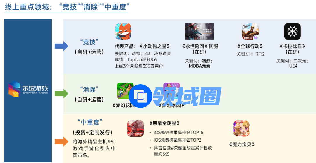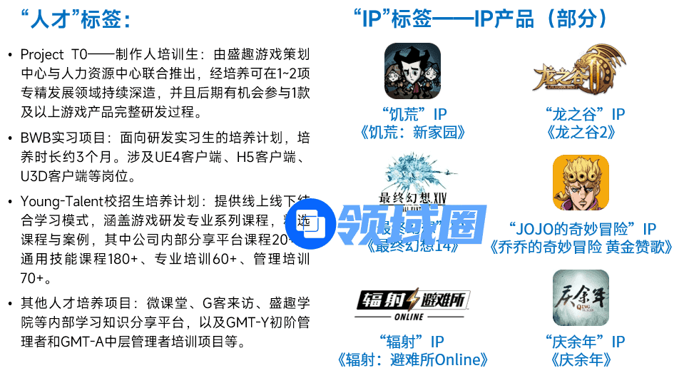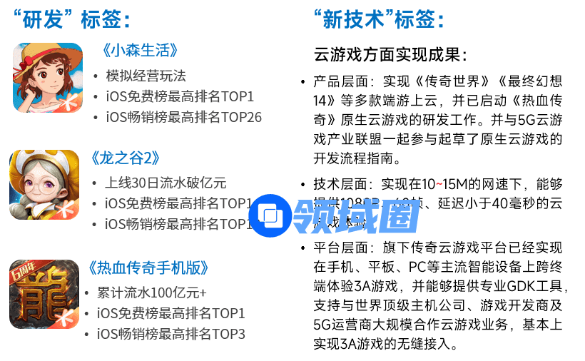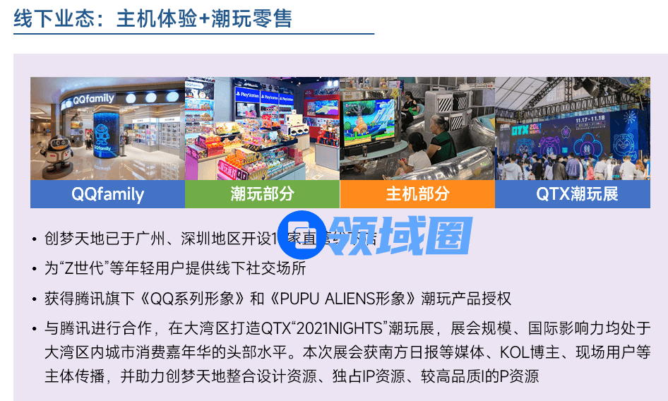 盛趣游戏技术及经验积累作用于“研发”品牌标签围绕强实用性塑造“人才”品牌标签盛趣游戏已有“研发” “新技术” “人才”“IP”等多项品牌标签。“研发”品牌标签主要来源于技术及经验积累,技术上,盛趣游戏持续打造研运中台,且近年年均研发投入超10亿元,是布局方向与力度的综合作用;经验上,盛趣游戏累计推出百余款产品,注册用户数量超过22亿,带来不同品类游戏研运经验,并帮助盛趣游戏主要产品中自研比例超50%。“新技术”标签方面,盛趣游戏布局较广较深,广度上已涉及云游戏、脑科学、元宇宙等领域;深度上以云游戏为代表,已投入到包括基础云层、平台层和云游戏平台三部分的技术研发工作中,并布局原生云游戏研发,布局方向均为领域重要组成部分。“人才”品牌标签主要通过多元、实用性强的培养计划打造,多元方面企业推出“BWB实习项目”“Young-Talent校招生培养计划”“Project T0——制作人培训生”等面向不同需求人才的培训计划;实用性方面,培训与项目关系较密切,部分批次的校招生在半年的培养后产出百余个业务课题,其中超50%用于实际研发项目,某种程度上实现人才与企业的双赢。“IP”品牌标签主要通过现有储备与持续获取打造,拥有“热血传奇”“传奇世界”“龙之谷”等头部IP是企业的IP储备背景,强化质量、授权把控是背景之下的塑造方式;IP获取上,研运实力是盛趣游戏获取“辐射”“最终幻想”等IP的重要原因,也在一定程度上证明业务优势可应用于多个领域。创梦天地围绕用户强化线上内容与线下场景布局打造线上线下24小时娱乐生活圈创梦天地品牌选择上以用户为核心,围绕线上娱乐内容与线下娱乐场景打造业务品牌矩阵,并探索长线的价值增长策略。线上业务层面,创梦天地聚焦在消除类和竞技类两个赛道进行自研和运营,并产出了《小动物之星》《梦幻花园》等多款代表性产品。在中重度游戏领域,创梦天地采取定制发行的方式,通过源代码的本地化,将海外精品主机/PC游戏手游化引入中国市场;线下业务层面,创梦天地以“一起玩”品牌为核心,布局“主机体验+潮玩零售”,主机领域现阶段已与任天堂、腾讯等知名厂商签订协议,打造体验式娱乐零售街区,线下品牌QQfamily的线下门店也已达18家。此外,创梦天地还与腾讯合作打造QTX“2021NIGHTS”潮玩展,助力“潮玩”品牌实现“设计-制造-销售”全产业链布局。未来,创梦天地线上线下业务有望实现协同效应,并通过科技与创意持续产出优质内容,进而与用户间形成稳定的互动模式,创梦天地也将围绕用户打造线上线下24小时娱乐生活圈。