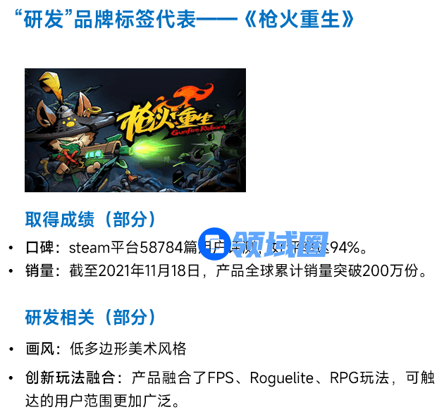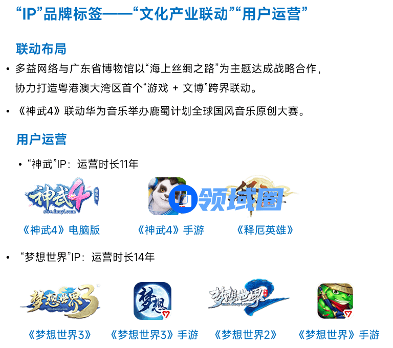 多益网络围绕IP展开文化产业联动及用户运营打造品牌标签研发品牌标签受成果反哺得到提升多益网络已拥有“IP”“文化产业联动”“用户运营”“研发”等多项品牌标签。其中,“文化产业联动”“用户运营”均为“IP”品牌标签的发展结果,前者通过与音乐、博物馆等产业深度、多次地联动形成,并借助文化产业的用户辐射范围获取更多用户;后者将服务IP粉丝作为主要目的,以“神武”IP为代表的长线运营、以《梦想世界3》为代表的扩充IP产品矩阵均为这一品牌标签的主要塑造方式。“研发”品牌标签既作用于IP、技术、新产品等多个方面,也受上述方面的成果反哺,获得强化。例如在技术方面,多益网络已在提高同屏人数、同服务器人数方面取得一定成果,这离不开对5G、AI、跨平台引擎等技术的探索;又如在新产品方面,PC端游戏《枪火重生》的口碑及销量均表现较佳,一定程度上提升多益网络在创新、玩法、画风等方面的研发品牌形象。