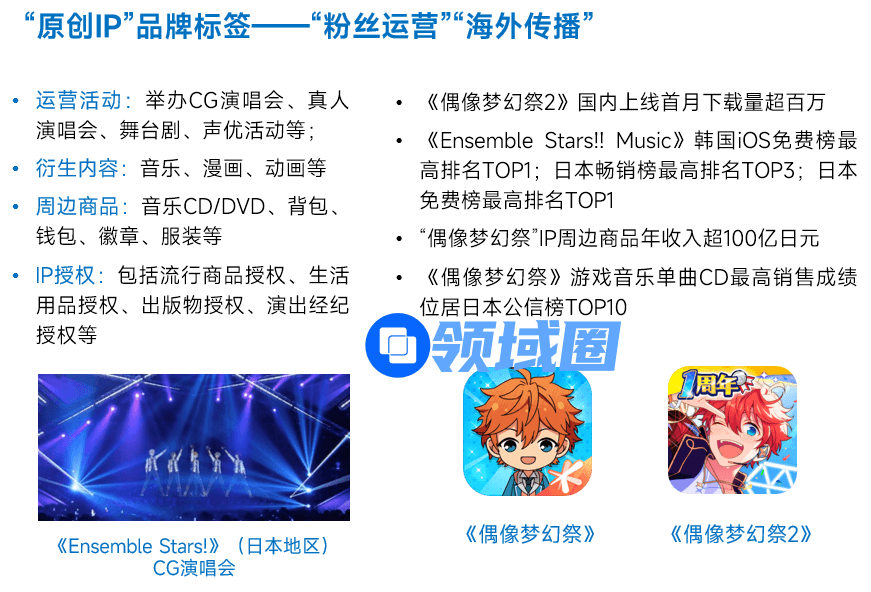 乐元素以用户体验为核心展开长线运营通过原创IP系列运营,打造核心品牌竞争力乐元素已有“长线运营”“原创IP” 等多项品牌标签。乐元素始终秉持着长线运营的理念,其旗下首款产品《开心水族箱》运营时长已超过12年,主力产品《开心消消乐》也超7年。塑造“长线运营”品牌的过程中乐元素将用户体验作为核心,例如通过与高频率更新的活动关卡、布局跨界联动、生成产品形象IP服务用户等方式实现长线运营。在打造“原创IP”品牌标签方面,继旗下“偶像梦幻祭”IP系列产品在日本地区取得一定成绩之后,乐元素围绕该IP进行全方位布局,通过举办虚拟live演唱会、推出衍生产品等拓宽“偶像梦幻祭”IP知名度。乐元素”原创IP”标签在国内外带来较多粉丝,现阶段粉丝以”偶像梦幻祭”IP为核心聚集,并帮助《Ensemble Stars!! Music》取得2021年Twitter游戏讨论榜全球TOP3的较佳表现。