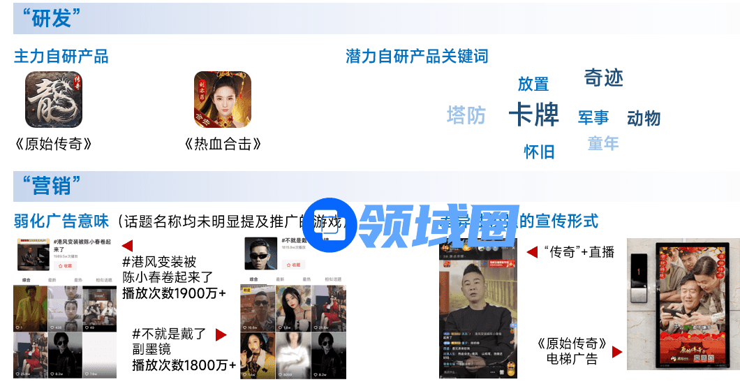 “营销”重注内容营销,“研发”有望拓展至多元产品贪玩游戏拥有“数据”“营销”“研发” 等多项品牌标签。“数据”的品牌标签由技术积累与数据驱动成果共同组成。技术积累方面,贪玩游戏自研大数据技术平台“旭量星海”,涵盖投放效果分析、智能投放等核心功能,现阶段已进行950亿次用户触达,积累注册用户超过2.5亿;数据驱动成果方面,基于分析成果为自有产品《原始传奇》选择的女性代言人取得了较佳的获客效果,一定程度上证明了技术平台的作用。“营销”品牌标签一方面通过内容营销塑造,关注度较高的话题“港风变装被陈小春卷起来了”“不就是戴了副墨镜”等营销事件均在弱化广告意味、激发用户好奇方面取得一定效果,进而吸引用户自发尝试;另一方面,贪玩游戏对其核心宣传点的把控能力较强,但并不对宣传形式设限,使得企业既可以持续发掘以代言人为代表的传统宣传方式的价值,也可以率先采取电梯传媒、“传奇”+直播等新宣传方式获取蓝海市场。“研发”品牌标签当前主要由《热血合击》《原始传奇》等头部“传奇”产品塑造,而随着自研经验在更多产品中运用,未来有望延伸至放置、塔防、卡牌、奇迹等多元产品中。