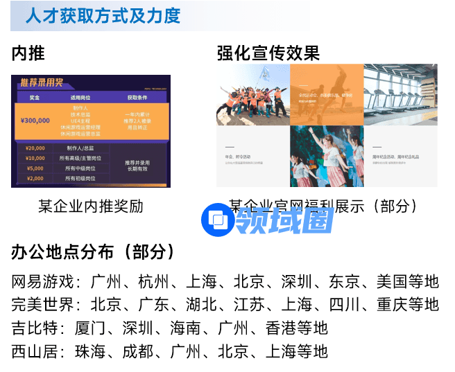 雇主品牌是游戏产业为聚集更多优秀人才所打造的品牌,有助于吸引或挖掘人才资源,进而推动企业的长期发展。在雇主品牌领域,游戏企业围绕求职者所关注的重点领域入手,通过提升薪酬福利、强化个人职业发展等方式塑造雇主品牌。薪酬福利层面,近年来游戏企业薪水上涨明显,整理多个求职平台大数据发现:平台上主流游戏企业平均提供薪资已超过1.3万元,也体现出游戏企业在薪酬层面的投入。