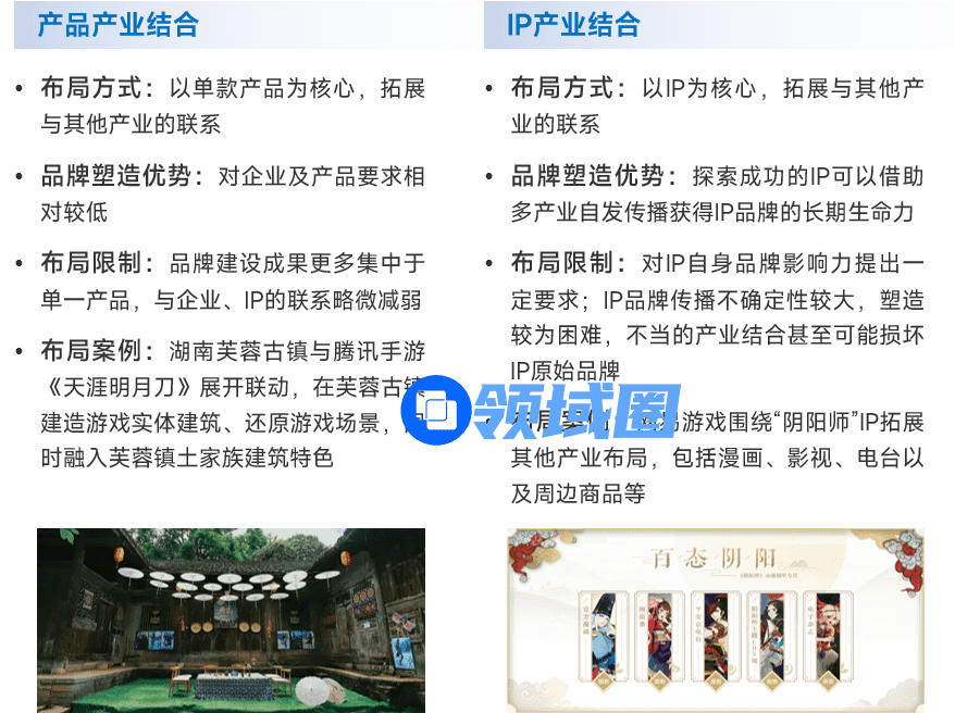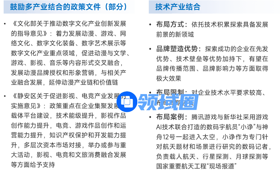 游戏产业是多领域交汇的综合产业,因而具备多产业结合的基础,尤其是在游戏产业已形成一定品牌影响力的基础下,有望进一步拓展游戏品牌价值边界。同时,已有多项文化产业发展规划明确提出多产业协同发展的需求,进而也将促进游戏产业布局多个文创领域。现阶段,游戏产业主要通过技术结合、产品结合、IP结合三种方式强化品牌价值拓展。同时,不同方式的布局周期、布局难度、品牌提升效果有所差异,企业需要综合自身实际情况进行选择。
